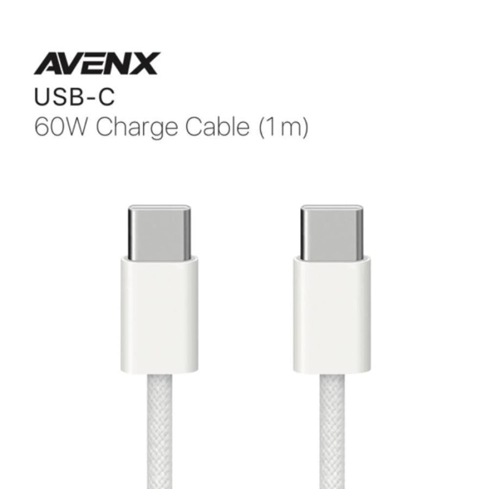 كيبل شحن USB-C إلى USB-C ماركة AVENX قوة شحن عالية تصل إلى 60 واط. يوفر سرعة شحن عالية لأجهزتك بكل أمان. يدعم نقل ومزامنة البيانات.