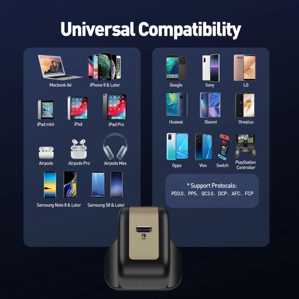 يتوافق هذا الشاحن مع مجموعة واسعة من الأجهزة المحمولة بما في ذلك الهواتف الذكية والأجهزة اللوحية والحواسيب المحمولة من مختلف العلامات التجارية. هذا الاتساق في التوافق يجعله حلاً شاملاً لشحن جميع أجهزتك المفضلة.